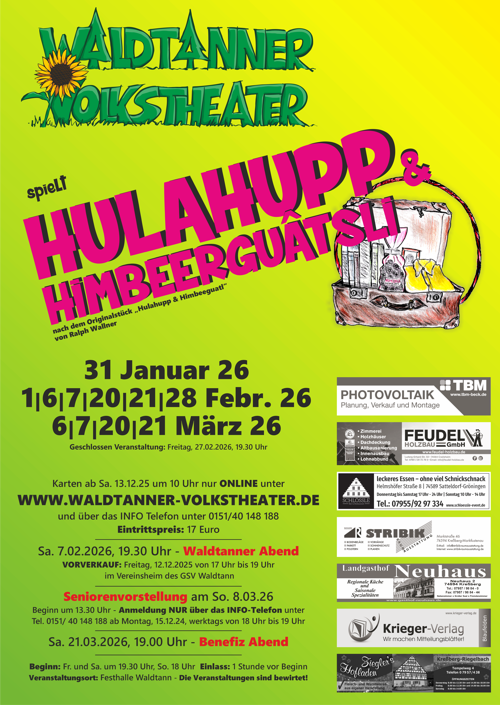 Die Proben für die neue Spielzeit des WALDTANNER VOLKSTHEATERS laufen auf Hochtouren. Wir spielen 2026 das Stück "Hulahupp & Himbeerguâtsli" von Ralph Wallner. Eine musikalische Komödie aus den 50ger Jahren.